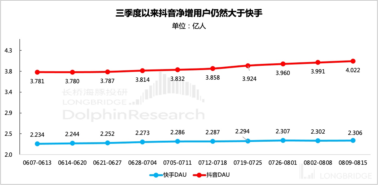 第三方数据显示,截至当前,快手与抖音之间的用户增长差距还未看到明显好转的拐点。