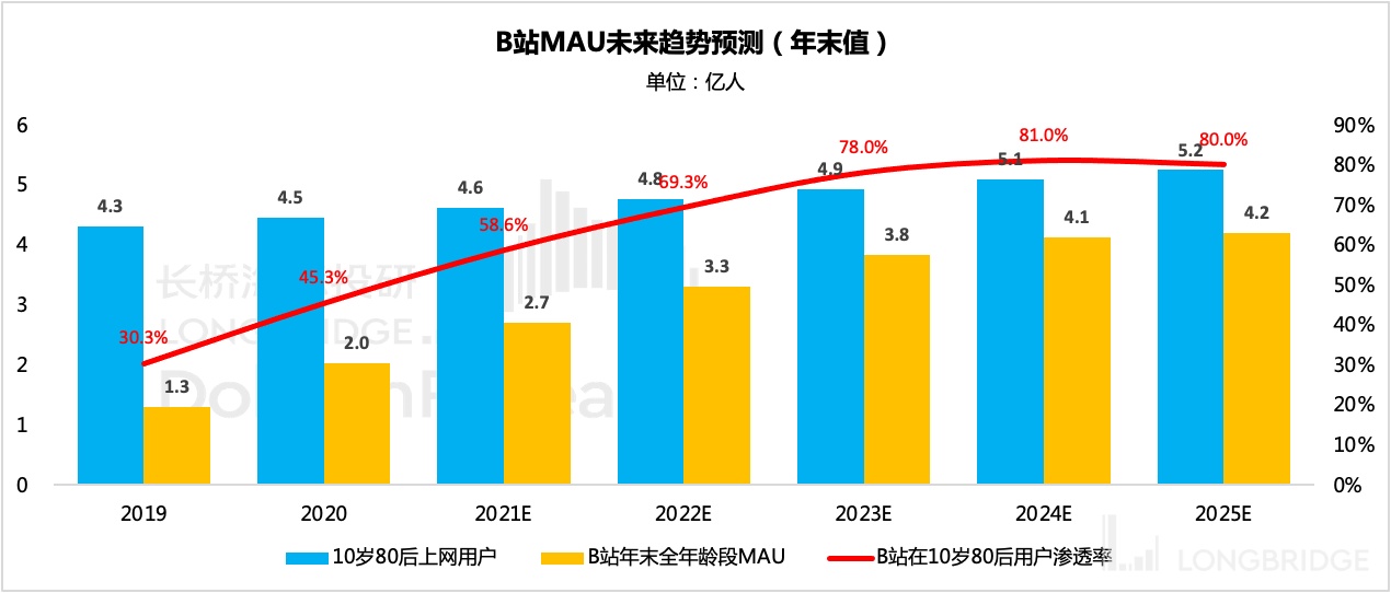 考虑到新生人口下滑、B 站契合的用户群体,海豚君认为 2023 年末很可能无法实现 4 亿的目标,除非继续往 70 后、60 后人群渗透。但这个出圈难度还是比较高的。