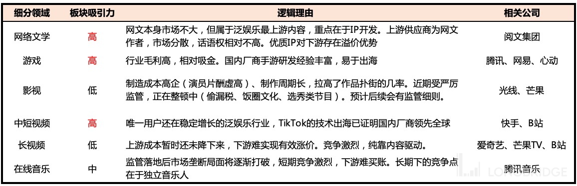 基于这样的优选逻辑,海豚君对泛娱乐概念下不同细分领域进行了对比。
