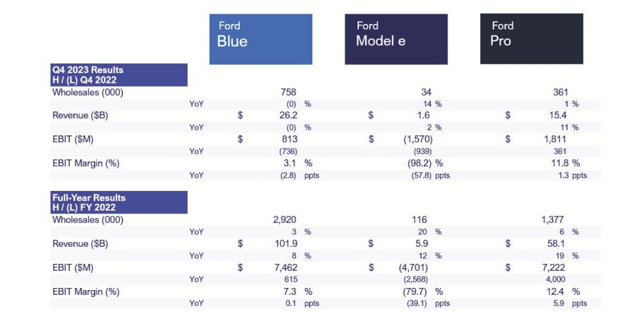 Ford Blue 专注于内燃机(ICE)领域,致力于燃油汽车和发动机的研发与生产,并为 Ford Drive 的移动出行业务提供支持。四季度的营收达到了 262 亿美元,利润为 8.13 亿美元,基本持平上年同期,EBIT 利润率增长 2.8 个百分点,至 3.1%。