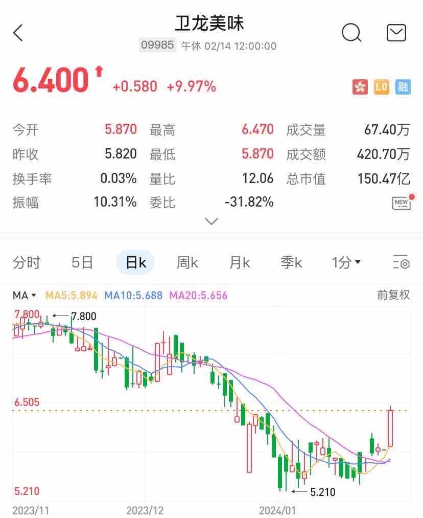 在港股市场中,卫龙美味(09985.HK)近期股价表现引人注目。随着春节假期的消费热潮,该公司股价上涨 9.97%,现价 6.40 港元,盘中最大涨幅更是高达 11.17%。这一走势不仅反映了市场对卫龙美味基本面的认可,也彰显了消费复苏带来的投资机遇。