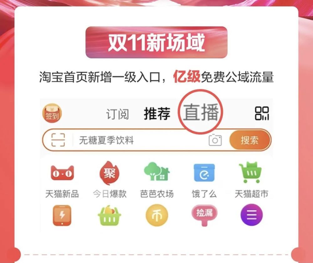 但马上双十一临近,直播在主 APP 内也做做成一个单独的场,放到了首页 app 上端的一级入口,与订阅/推荐并列。