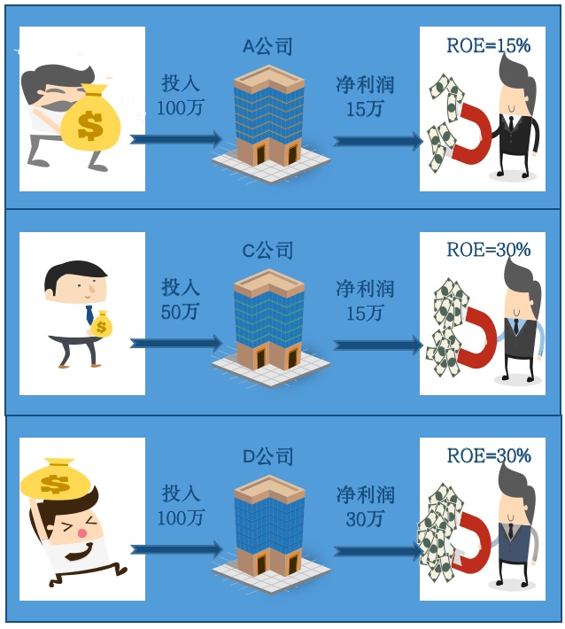 同样投入 100 万,但 A 公司只能赚 15 万,而 D 公司却能赚 30 万,显然,ROE 更高的 D 公司盈利能力更强。