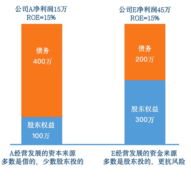 例如,同个行业的两家公司 A 和 E,ROE 都是 15%,但 A 公司的债务水平比 E 公司高,更容易因为外部环境的冲击,面临更大的偿债压力和破产风险。