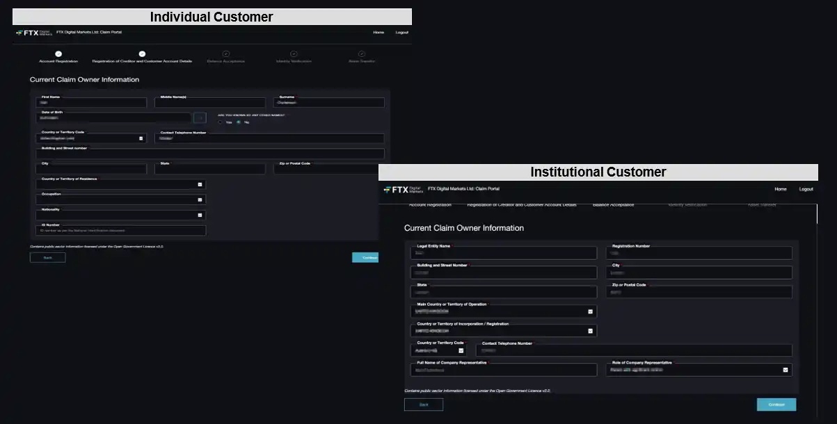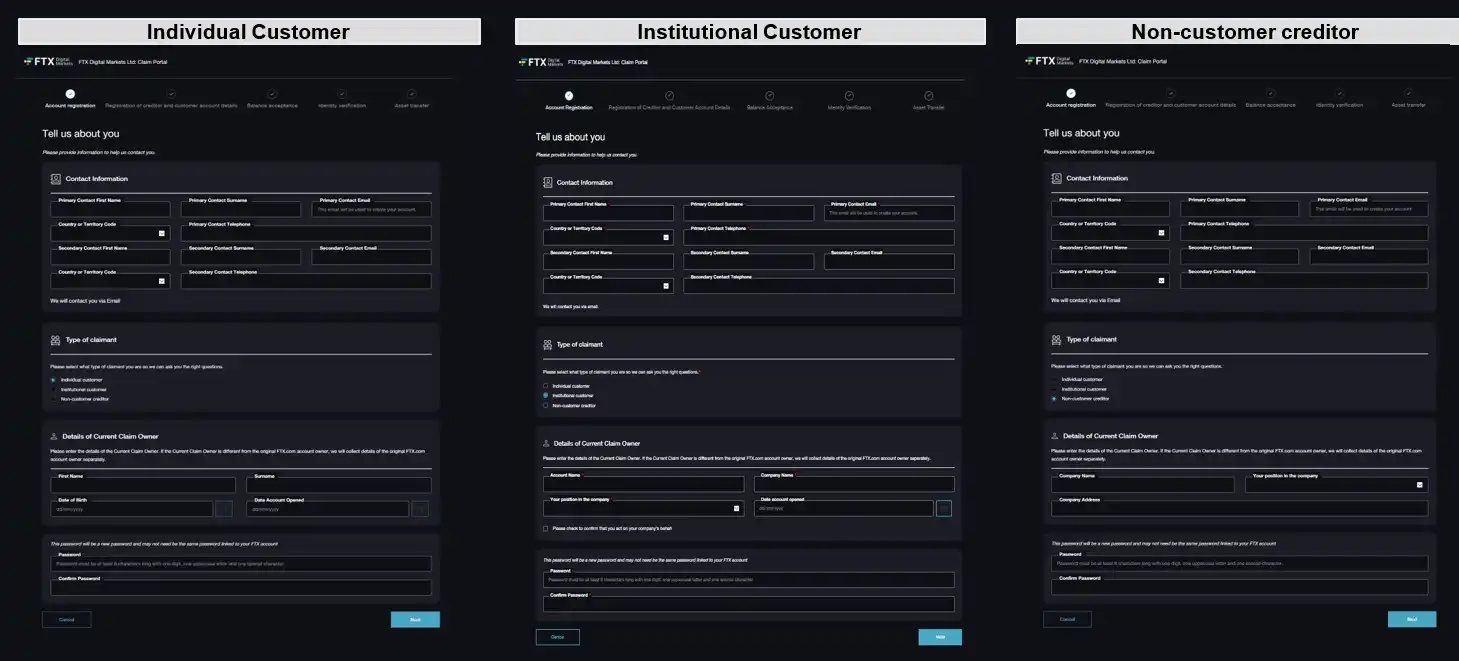 这里需要注意的是,个人客户是指以个人名义对「FTX.com」或「FTX International」提出索赔的客户;机构客户是指以公司名义对「FTX.com」或「FTX International」提出索赔的客户;非客户债权人则是指向 FTX Digital 提供商品或服务的交易债权人(有一小部分员工可能属于这种情况),这三种类型的注册信息并不一样,具体可参加下图: