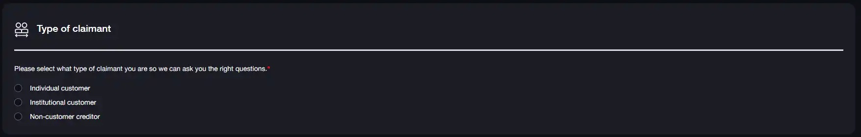 按照 FTX 的要求,创建帐户需要提供联系信息和详细信息(包括姓名、电话号码和电子邮件地址、出生日期和开户日期,如上图),以及索赔人类型(包括个人客户、机构客户和非客户债权人,如下图)。