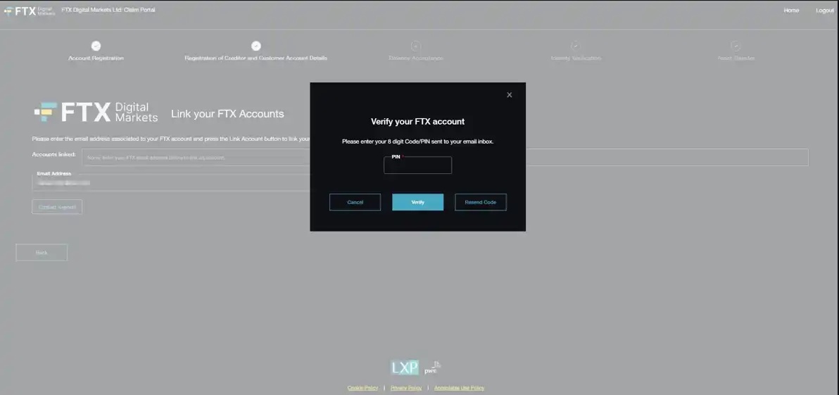 · 第 2 步:链接 FTX 账户,输入 FTX 账户的电子邮件地址,此时将会把 FTX 账户链接到一个 FTX Digital 索赔门户账户,输入电子邮件地址后,验证码将发送到您链接的电子邮件地址以验证是否拥有这些帐户的权限。