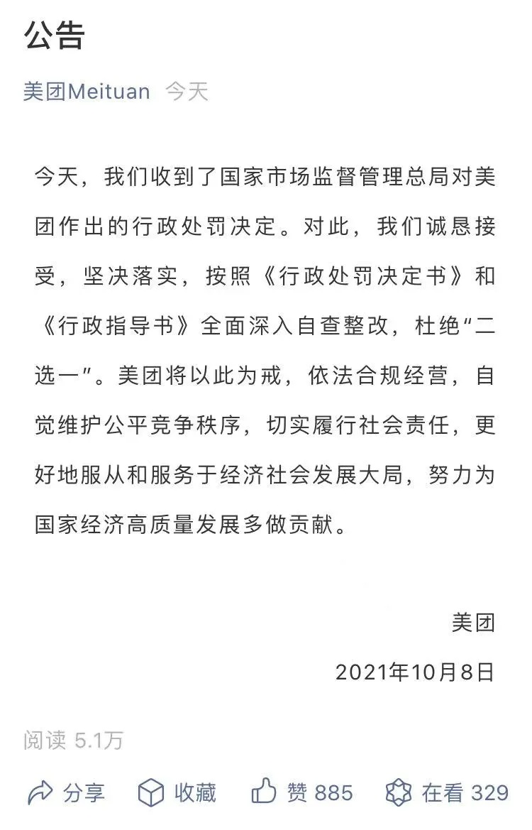 今天,我们收到了国家市场监督管理总局对美团作出的行政处罚决定。对此,我们诚恳接受,坚决落实,按照《行政处罚决定书》和《行政指导书》全面深入自查整改,杜绝 “二选一”。美团将以此为戒,依法合规经营,自觉维护公平竞争秩序,切实履行社会责任,更好地服从和服务于经济社会发展大局,努力为国家经济高质量发展多做贡献。