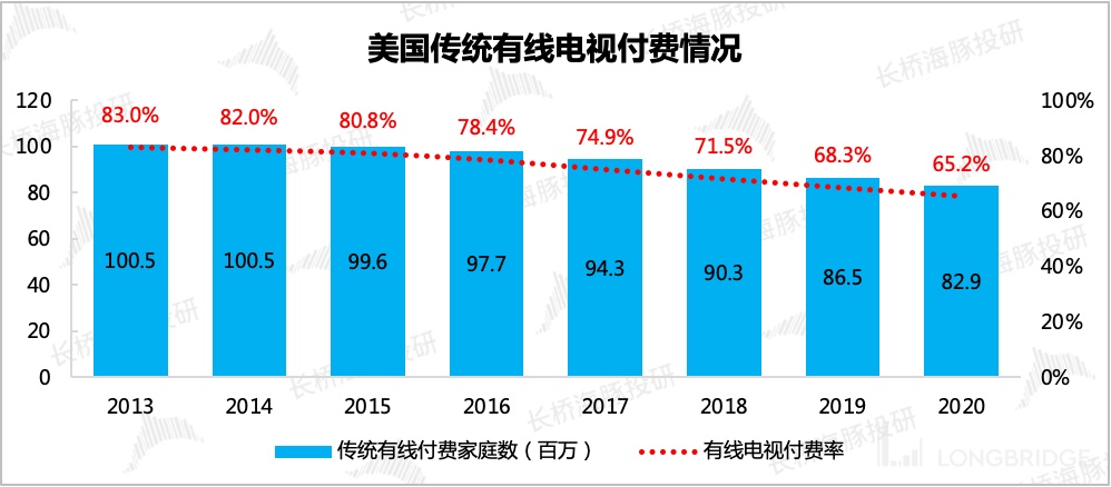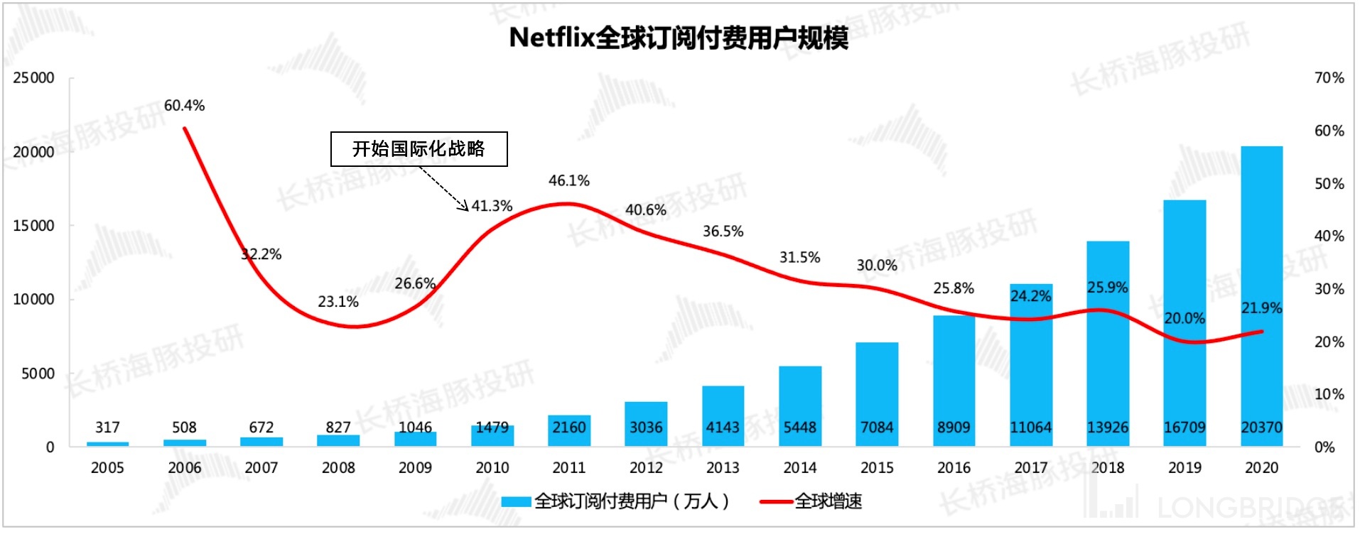 受文化习惯的影响,美国本土市场中,线下电视媒体用户规模一直很大。但早在 2005 年,原本做 DVD 租赁生意的 Netflix 就已转型流媒体平台,但早期增速衰减得很快。也就是在近十年,开始走出国门做全球市场之后,用户增长才再次发力。