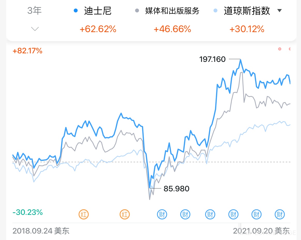 作为一家从 1957 年就上市的公司,创立百年成长为一个 3000 多亿美元的全球巨头。如果不考虑分红,迪士尼的这个增值速度和现在动不动就跑步上市,随便估值就上千亿的互联网公司比起来,显然非常一般。但并不妨碍迪士尼也曾经受到过股神巴菲特的青睐。