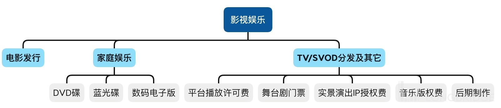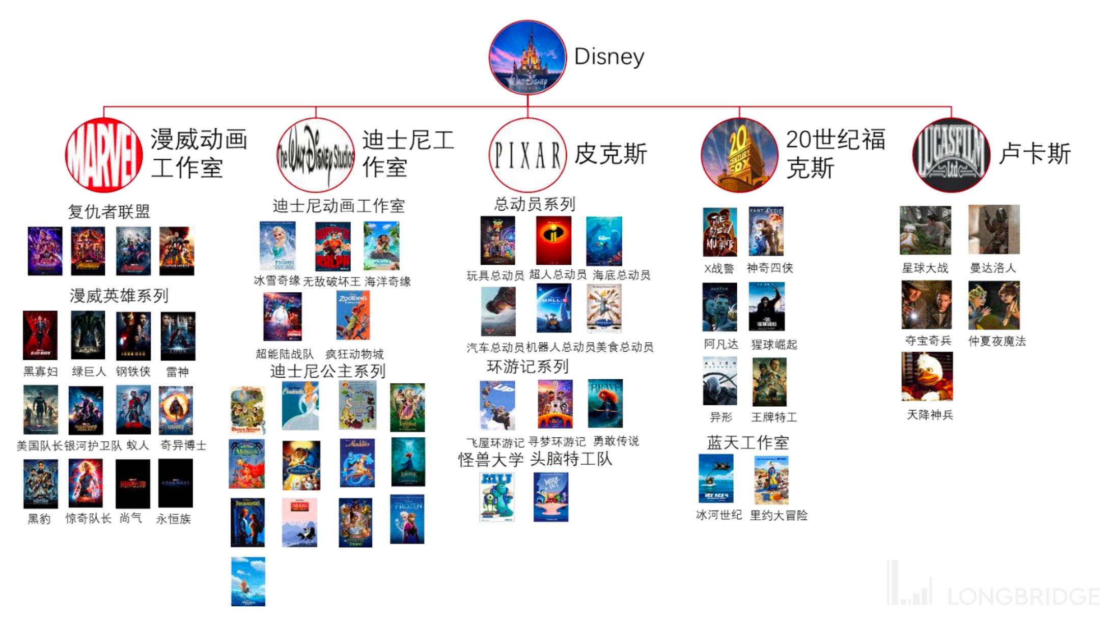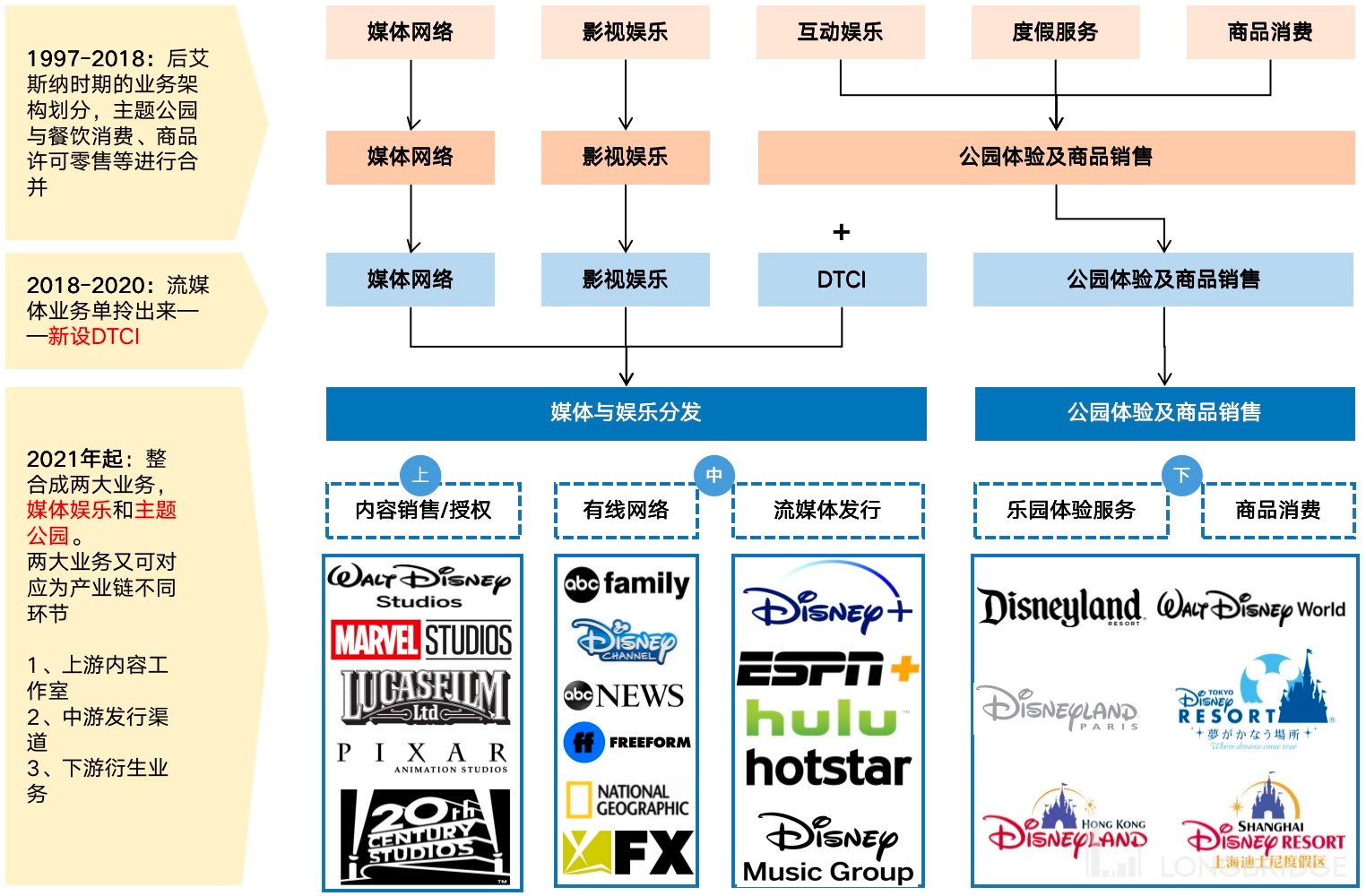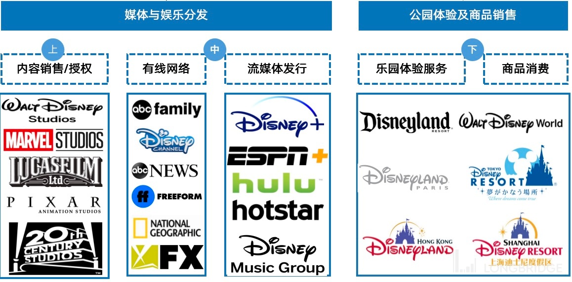 如今,迪士尼已经发展为一个毋庸置疑的全产业链娱乐巨头,从上游的内容制作、发行,到下游的渠道以及衍生业务,均有涉猎。