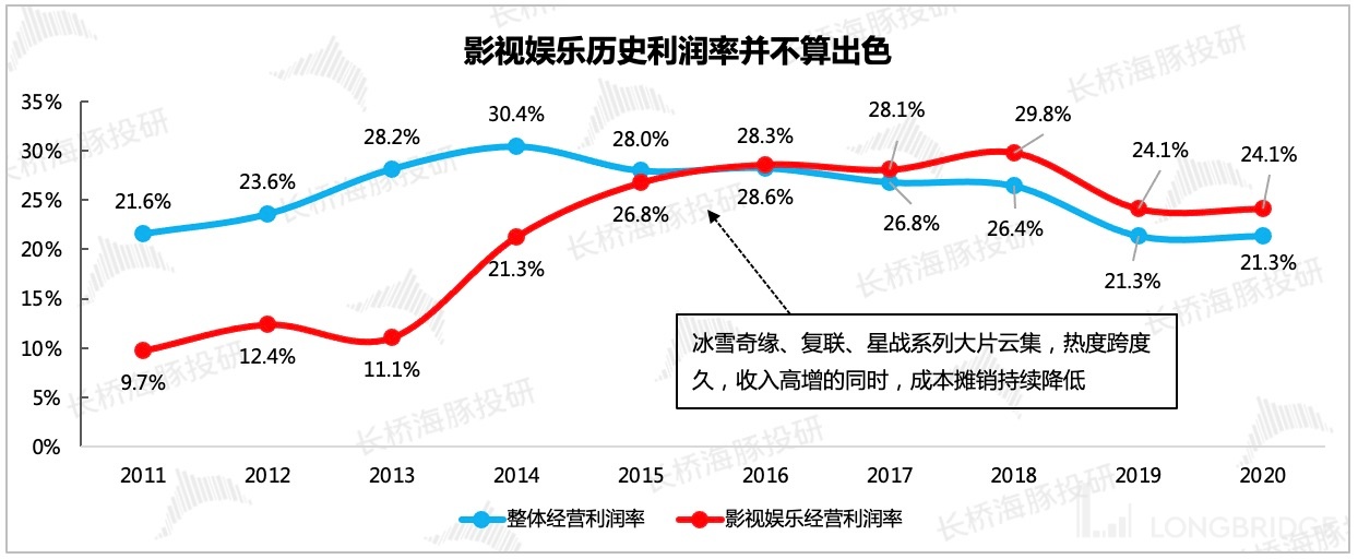 内容创新虽然深藏在迪士尼公主的皮相之下,但却是公主的 “立身之骨”。从赚钱的角度来看,影视娱乐利润率不算高,并且爆款仍然存在赌概率的成分。投入周期长,成本高,往往会被市场无意间弱化它对公司业绩成长的重要性。历史上影视娱乐的经营利润率远低于整体水平,近几年由于爆款密集,热度持续性非常好,后期低成本摊销时期仍然有较好的收入增长,才使得影视娱乐的利润率陡然好转。