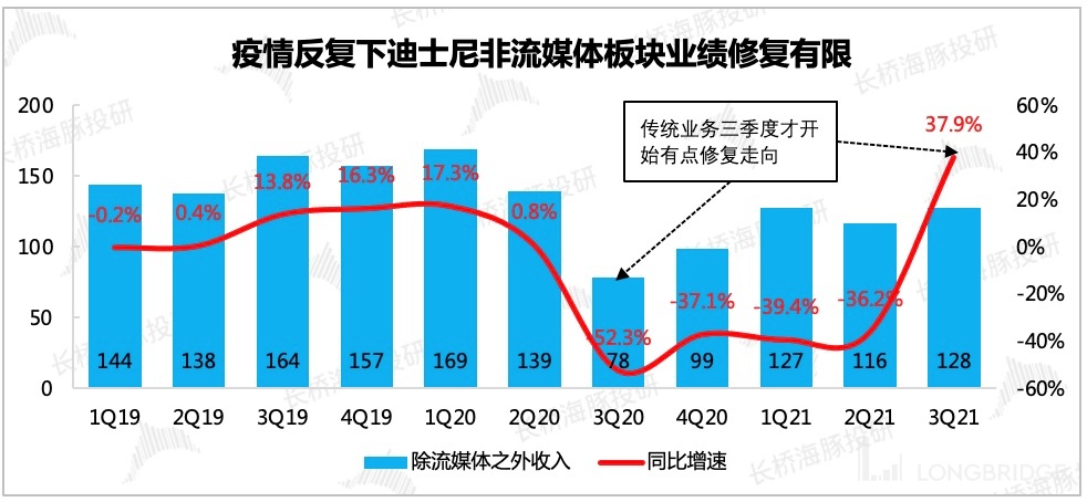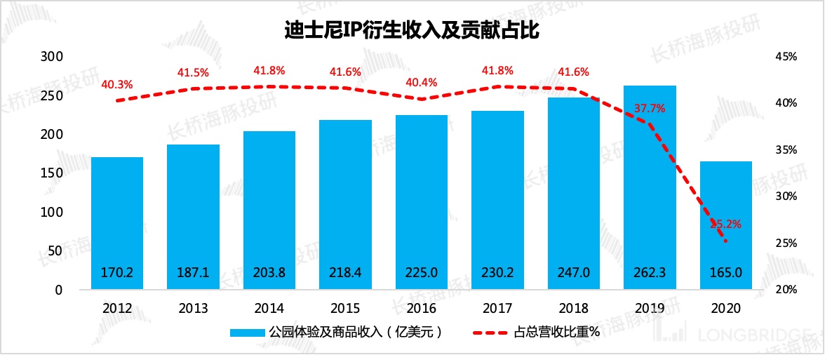但整个迪士尼更像是一个娱乐王国,主题公园只是它其中的一个模块,其收入贡献已经连年走低,去年更是受到疫情的影响,占比已经下降到了 1/4。