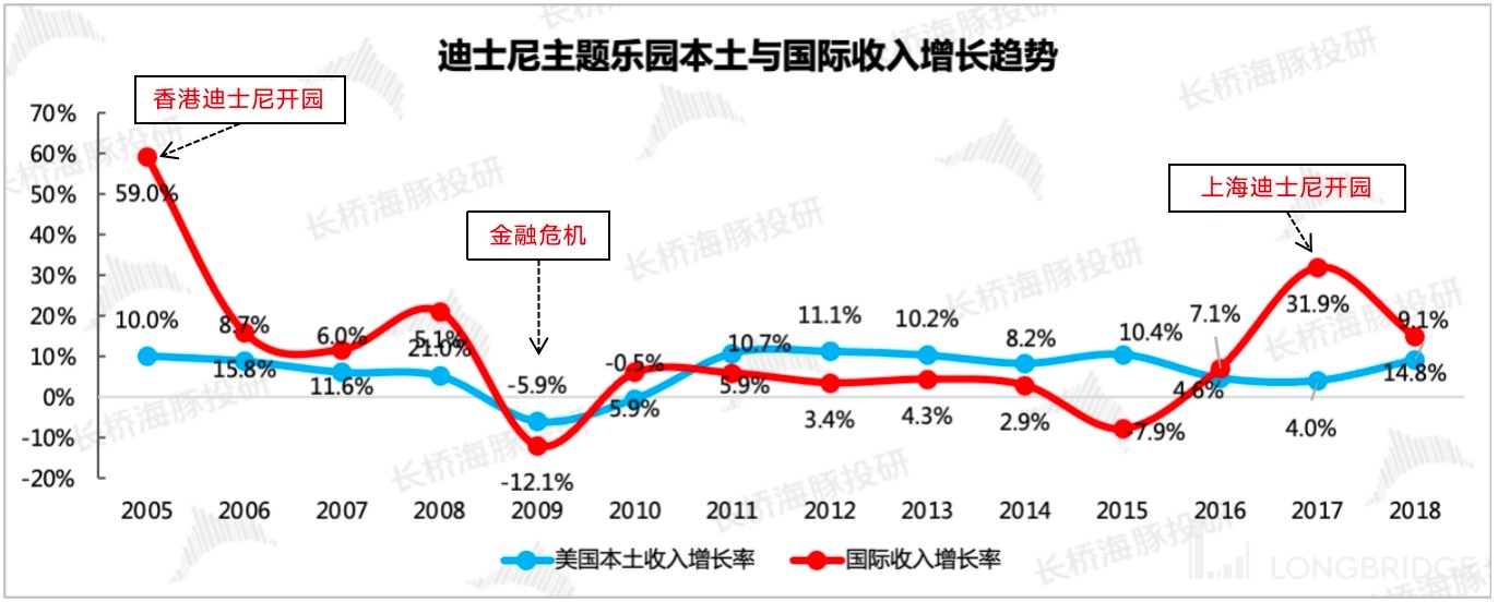 而迪士尼主题公园的扩建,也会不断的激活传统公园业务的增长活力。比如随着 2005 年香港迪士尼、2016 年上海迪士尼落成,中国市场的开拓使得早已成熟的主题公园业务,收入增速未出现趋势性的下降,反而稳定在一个正增长范围区间,龙头的强势性可见一斑。