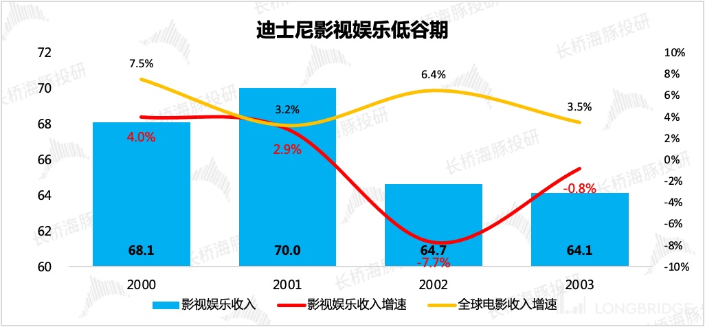 艾斯纳对 IP 创作持续的不重视导致当时迪士尼的第二大收入支柱——以迪士尼电影动画发行收入为主的影视娱乐(电影发行、家庭数码、授权分发及其它),在 2000-2003 年期间均低于全球增速。
