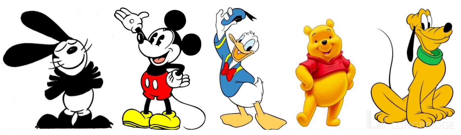 与中国目前主要的娱乐龙头主要从 “流量渠道” 的出身不同,迪士尼是从 “内容制造” 起家的。20 世纪 30 年代的迪士尼,可以说是一个疯狂的 IP 输出机。从 1923 年至 1940 年期间,迪士尼创作了多个经典动画角色,除了开头提到的公主们,还有幸运兔奥斯瓦尔德、米老鼠米奇、唐老鸭、小熊维尼、布鲁托等等至今还耳熟人心的经典 IP。