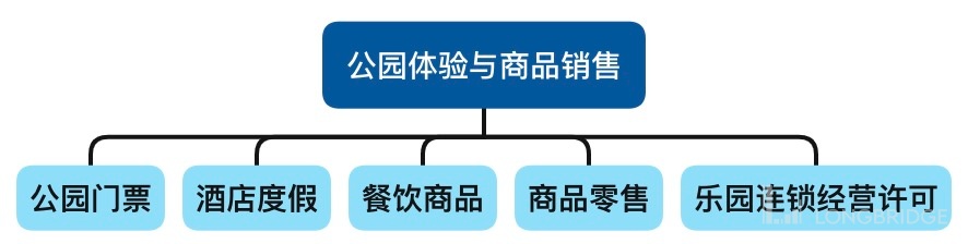 主题公园的收入来源,除了最直接的门票收入外,占比大头的则是来自于园区的酒店、餐饮以及商品零售收入。在 2018 年的组织架构调整中,迪士尼的主题公园业务与原先的消费品业务(IP 授权、迪士尼商店零售)、互动娱乐业务(游戏收入)进行整合,合称为【公园体验与商品销售】,可以理解为对迪士尼旗下 IP 进行再开发的衍生收入。