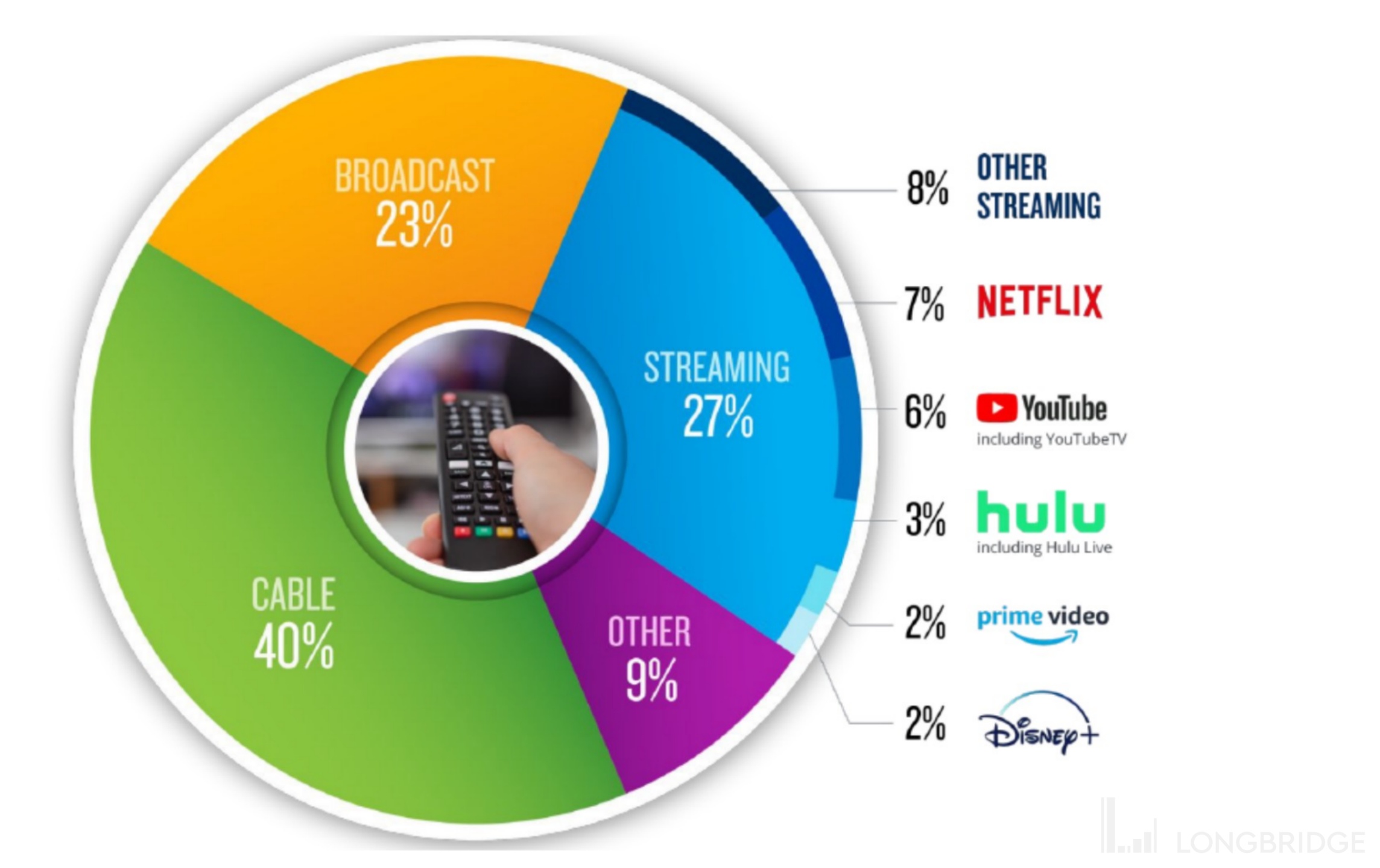 而第三方 eMarketer 和尼尔森的数据均显示,哪怕是流媒体正在享受疫情红利的当下,美国传统有线电视的份额仍然占大头。