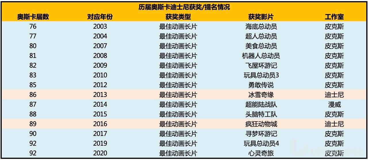 当然,这主要还是得益于迪士尼一路买 IP 的战略部署。比如从历届奥斯卡动画长片奖、票房排名靠前的电影,背后所属的工作室分布来看,其实不少都出自外购的工作室。