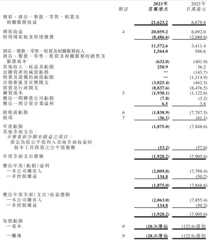 在营收方面,澳博控股全年实现营收 216.23 亿元,同比增长 224%。从具体业务来看,无论是核心博彩业务还是酒店、参与等其他业务都实现了大幅增长,这主要也是和澳门旅游业在过去一年高速恢复有关系。