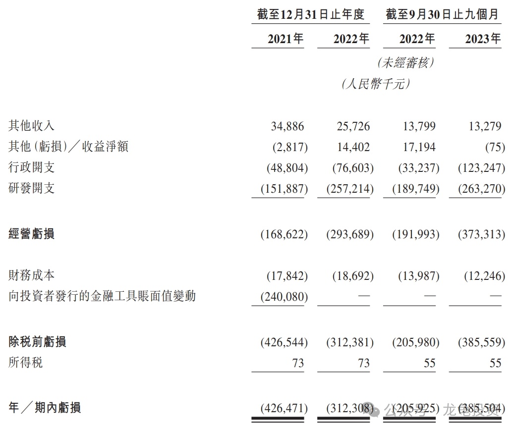 经营亏损:2021 年亏损 1.68 亿人民币,2022 年亏损2.93 亿人民币,2023 年截至 9 月 30 日最近 12 个月亏损 4.75 亿人民币;