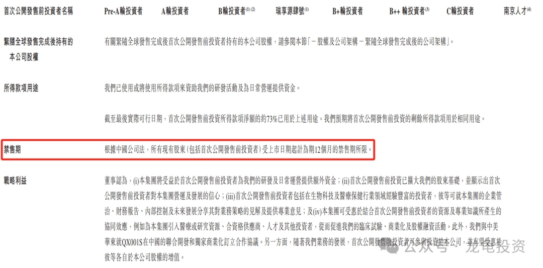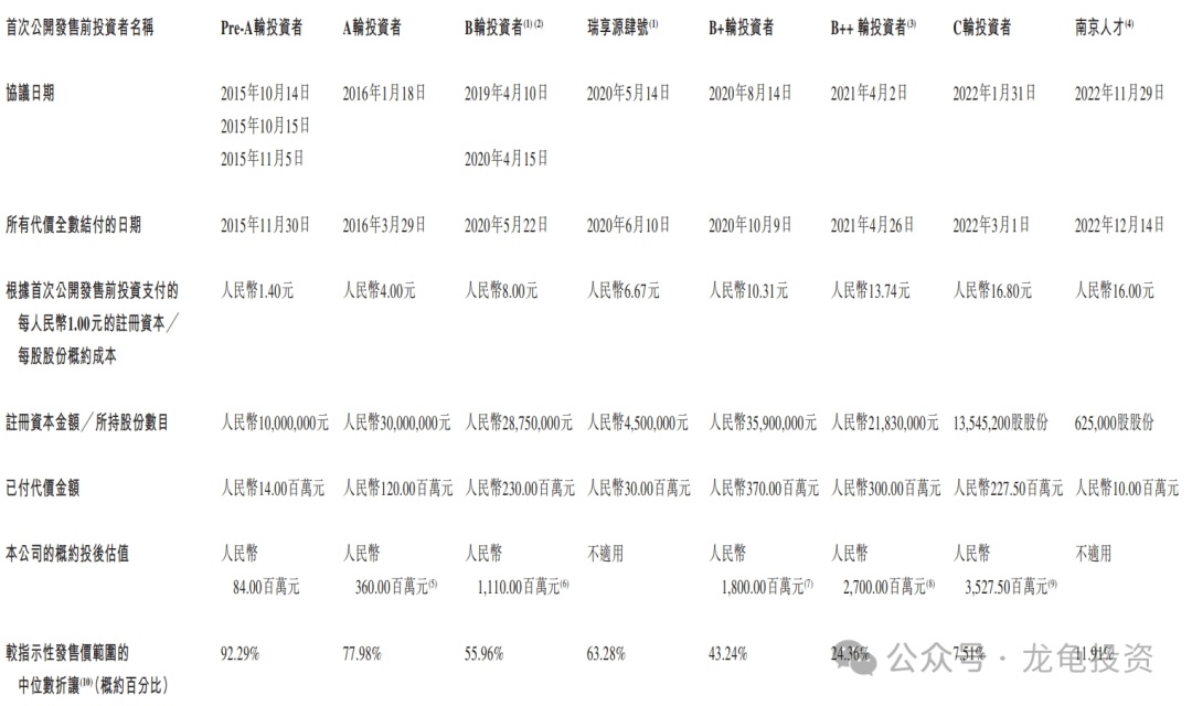 公司于 2015 年至 2022 年共引入多轮 IPO 前投资者,最后一位投资者南京人才共投资金额 1000 万人民币,每股成本 16 元,较发售价中位数折让 11.91%。所有现有股东禁售期 12 个月。