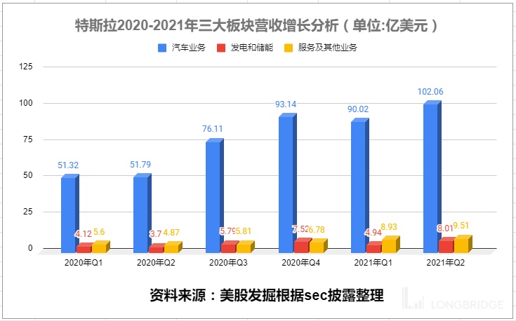 我统计出了 2020 年-2021 年汽车业务、发电和储能业务、服务及其他业务三大业务增长情况,2021 上半年,其中核心收入汽车业务、服务及其他服务同比增长接近 100%,发电和储能业务增长接近 70%,且储能业务由亏转盈。