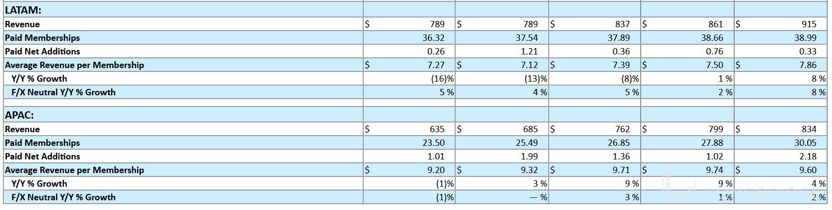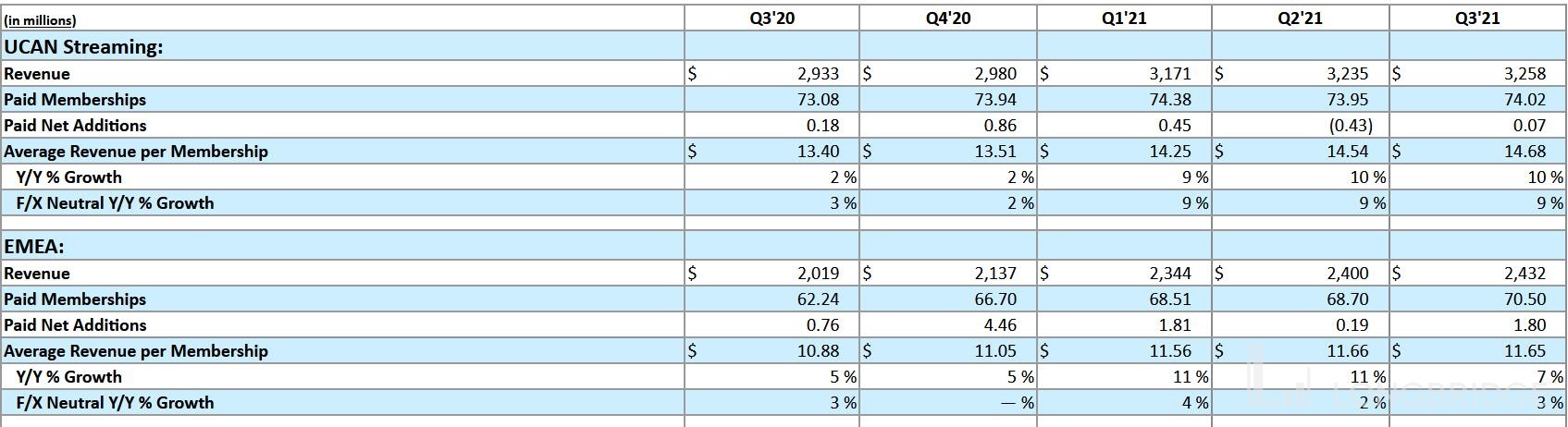 Q3 季度奈飞没有预测到净付费的增长 (实际为 440 万,预测值为 350 万),最终付费会员人数为 2.14 亿,与其的预测相差不到 0.4%。随着奈飞不断改善在该地区的服务,亚太地区连续第二个季度成为会员增长的最大贡献者,新增付费会员 220 万人 (占总付费净增加人数的一半)。在EMEA(欧洲&中东),由于几款游戏的强大影响力,付费净增额从第二季度的 18.8 万增加到 180 万。UCAN(北美洲)和LATAM(拉丁美洲)区域的付费会员增长较为缓慢。这些地区的宽带家庭普及率较高,但奈飞相信,随着其的业务改进,该区域仍有充足的增长空间。确实如此,北美和欧洲基本是成熟市场了,但是拉美和亚洲这些人口大洲还具有着广阔的市场前景,势必将成为未来的订阅量增长点。