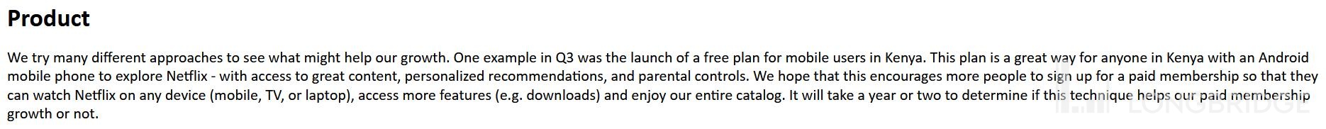 在全球总订阅人数突破 2 亿人后,奈飞似乎陷入了增长疲软期,所以其在报表中也提到了在人均时间占用方面的增长点,以及新兴市场的增长点。现有大量活动竞争消费者的时间和注意力,比如看电视、读书、浏览 TikTok 或玩《堡垒之夜》(Fortnite),等等。举个例子,10 月 4 日,当 Facebook 经历了几个小时的全球宕机,奈飞用户粘性在这段时间内增长了 14%。同时根据尼尔森的数据,在美国这一最大和最渗透的市场,奈飞仍然不到美国电视屏幕时间的 10%。以及在以肯尼亚为例的新兴市场,奈飞也先从安卓手机端来开发用户市场。虽说这些发力点会给奈飞找到方向,但从侧面也反映出了奈飞的用户增长焦虑。