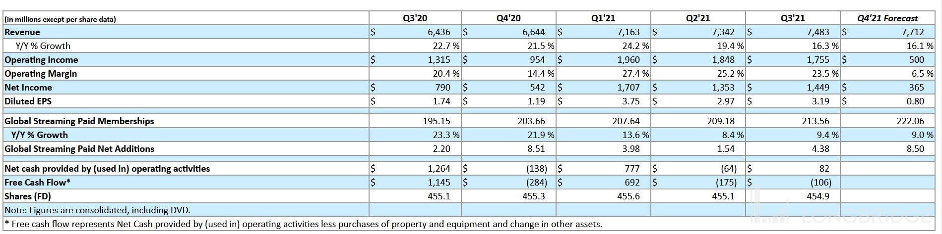 报表中说道:“由于 2020 年新冠肺炎相关生产延迟,第一季度和第二季度的产量低于正常水平,在下半年将看到了更强劲的产量带来的积极影响。第三季度,我们的营收同比增长 16%,达到 75 亿美元,而营业收入同比增长 33%,达到 18 亿美元。本季度末,我们增加了 440 万付费会员(20 年第三季度为 220 万),拥有 2.14 亿付费会员。我们很高兴能在今年第四季度推出最强劲的内容产品,这表明内容成本上升,运营利润率下降。” 由此可见,奈飞对今年的业务恢复充满了自信,第一二季度的制作内容将在第四季度全面开花,同时在第三季度就已经出现了一个全球爆款,给后续的剧集加满了自信。但是,我们从中也可以窥见奈飞的老毛病——制作成本的不断飙升,运营利润的下滑。”(后文会专门分析)