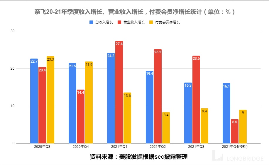 进入 2021 年,Netflix 从营收增长看不再是一家高速的公司。从下面的统计图可以看出,虽然 Netflix 的增长率表明 2021 年第三四季度的收入同比增长仅为 16%。但是奈飞的营业利润增长却提高到了 25% 左右。