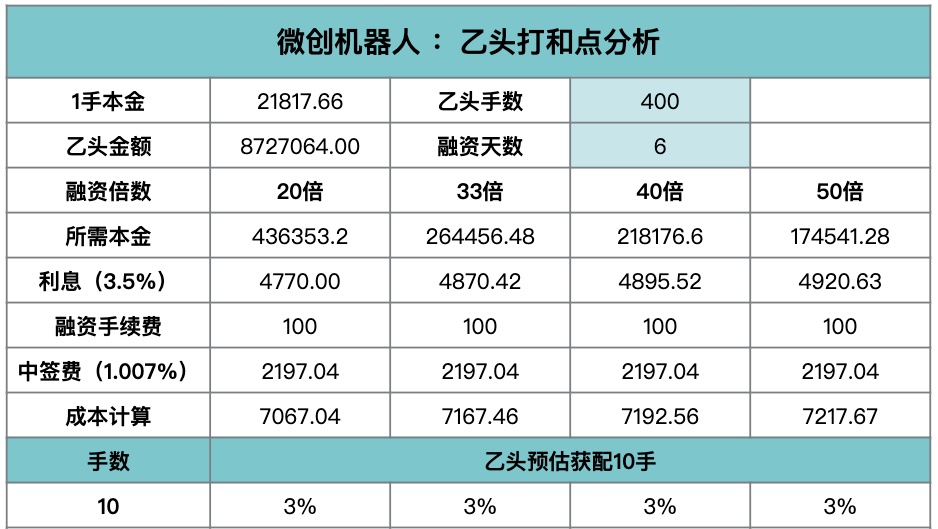 乙头申购 400 手,所需资金 872.7 万,预估中签 10 手,计息 6 天,加上融资手续费、中签费,打和点预计在 3%,打和点不高,。