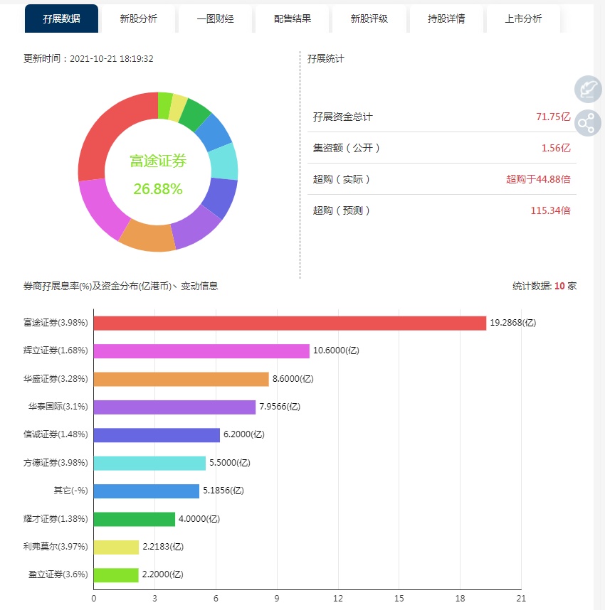 再来看看申购人气,从捷利交易宝提供的孖展数据来看,截止 10 月 21 日 18 点 19 分,超额认购总数是 44.88 倍,预测最终会超购 115.34 倍,从这个数据来看招股第一天能超购 44.88 倍已经很不错了,至少在最近这段时间的新股里算是人气比较旺的一只新股了,说明大多数人都比较看好。