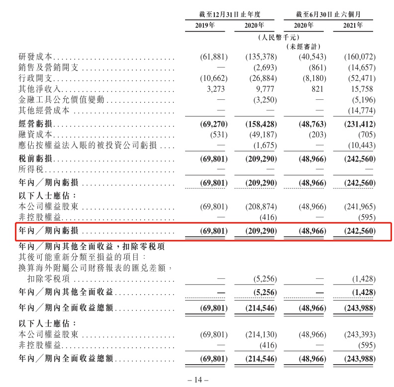 接下来看看公司的经营情况,公司的产品目前还处于研发阶段,还没有正式开始商业化,所以目前为止还没有收入,还处在亏损状态,从 2019 年~2020 年,分别亏损 6980.1 万、2.09 亿;从 2020 年上半年到 2021 年的上半年,分别亏损 4896.6 万、2.43 亿,可以看出亏损还在继续扩大。