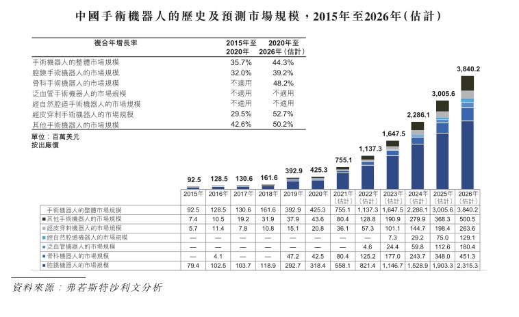 中国手术机器人市场仍处于早期发展阶段,但增长潜力巨大。于 2020 年,中国手术机器人市场的市场规模为 425.3 百万美元。预期手术机器人市场将以 44.3% 的复合年增长率快速增长,于 2026 年达到 3,840.2 百万美元。