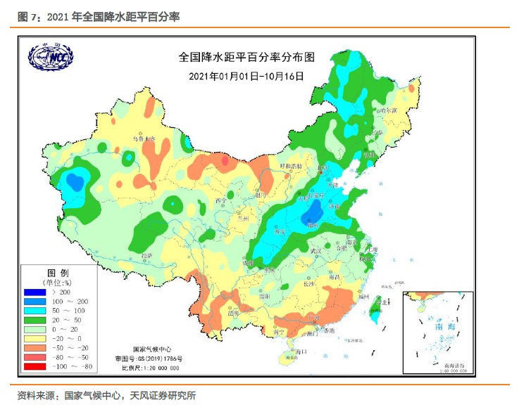 先说缺水,如下图,今年我国 “南旱北涝” 现象比较严重。华北地区多雨的时节通常是每年 7 月中下旬至 8 月上中旬,但今年 9 月以来北方地区降水量比常年同期多 1.4 倍,中原地区如陕西、山西、河南等地区出现了洪涝灾害。