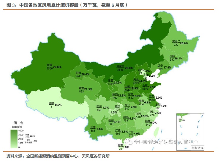 再来看 “少风” 问题。我国风电装机大部分在北纬 35-65 度的地区,主要是新疆、甘肃、内蒙、青海、宁夏北部省份,这里的风资源比较充足。但是最近几年风电效率持续降低,2020 年是 1472.7 个小时,比 2018 年下降了 16.6%。