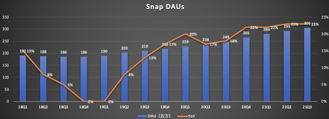 经过 10 多年的发展,Snap 的活跃用户保持稳定增长。财报显示,Snap 第三季度每日活跃用户(DAUs)人数为 3.06 亿,同比增长 23%。