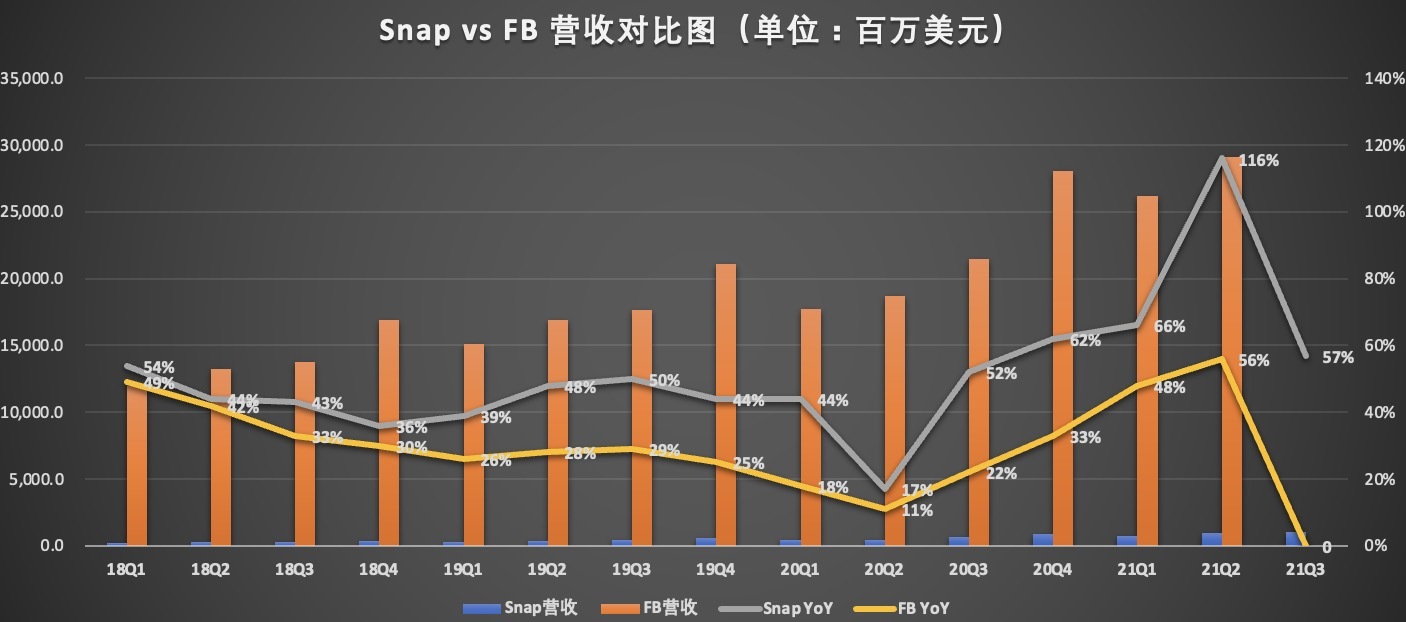 首先,Facebook 营收规模远超 Snap,季度营收同比增速 Snap 甩开 Facebook。