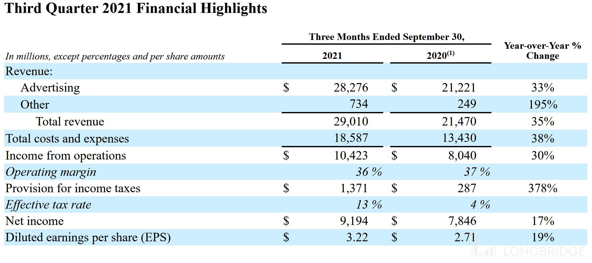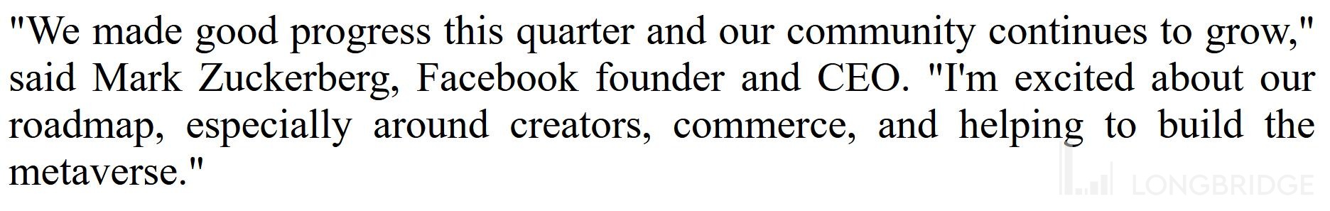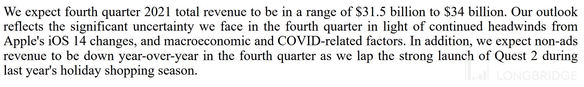 “我们预计 2021 年第四季度的总收入将在 315 亿美元到 340 亿美元之间。我们的展望反映出,在苹果 iOS 14变化、宏观经济和 Covid - 19 相关因素的持续不利影响下,我们在第四季度面临着巨大的不确定性。此外,我们预计第四季度非广告收益将同比下降,因为我们在去年的假日购物季推出了 Quest 2。”