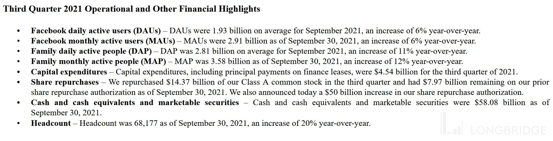 4.脸书在第三季度回购了 143.7 亿美元的 A 类普通股,截至 2021 年 9 月 30 日,之前的股票回购还剩下 79.7 亿美元,然后还将宣布增加 500 亿美元的股票回购授权。看来脸书的管理层估计是要用大量股票回购来稳定市场情绪,可别让股价在系列利空中一泻千里,但从现股价看来,效果有限:股价不上不下。希望后续 500 亿的回购计划能把实现元宇宙版图前的股价给稳住,可别 “出师未捷身先死” 了。