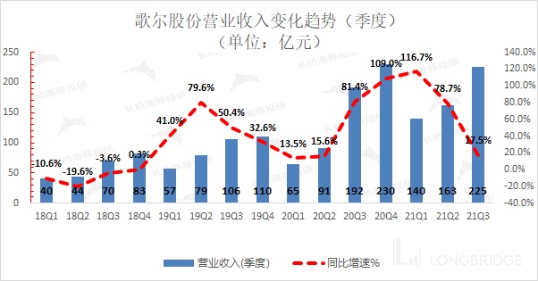 歌尔股份 2021 年第三季度总营收 225 亿元,同比增长 17.5%,略低于彭博一致预期(233.67 亿元)。