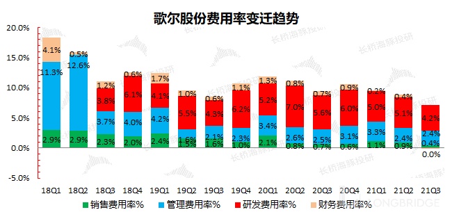 2021 年三季度歌尔股份四项费用合计 15.93 亿元,同比减少 11.4%。四项费用率 7.1%,四项费用率的下滑主要来自于公司业务扩大的规模效应以及财务收入的增加。