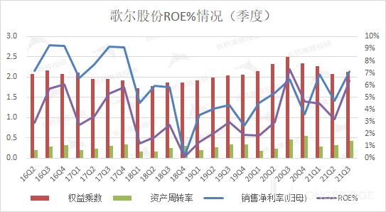 2)权益乘数:2021 年三季度歌尔股份权益乘数为 2.13,环比相对平稳(+0.06)