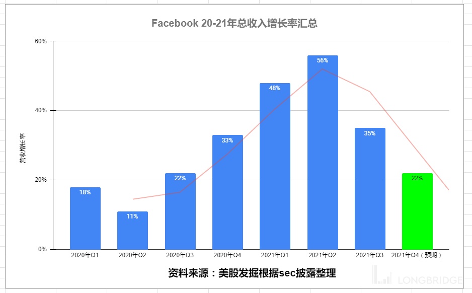Facebook 三季度总收入为 290.1 亿美元,相对于 2020 年 3 季度 214.7 亿美元,同比增长 35%。相对于 2021 年一季度 48% 的营收增速和二季度 56% 的营收增速,出现明显的放缓。