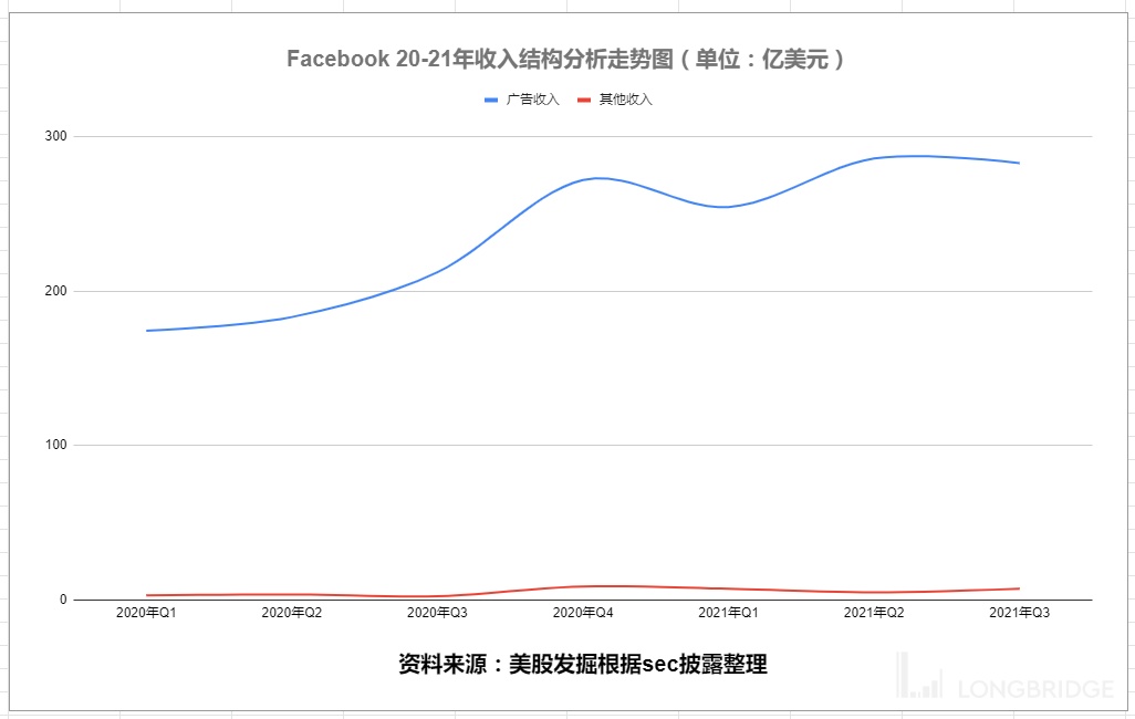 Facebook 的营收来源主要分为两种,广告收入和其他收入,第三季度广告收入为 282.76 亿美元,同比增长 33%。其他收入为 7.34 亿美元,在 Quest 2 销售强劲的推动下增长了 195%。