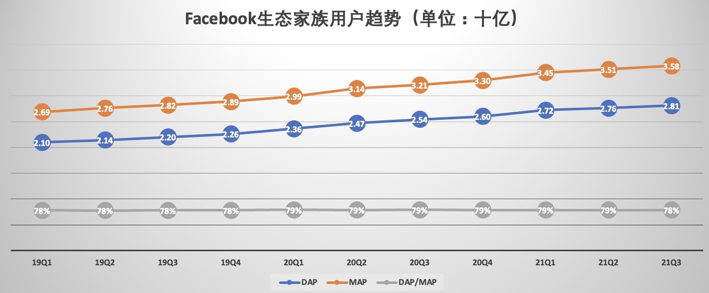 包括 Facebook、Messenger、Instagram 和 WhatsApp 等在内应用家族的日活用户为 28.1 亿,同比增近 10.6%,高于 Facebook 平台的增速,月活用户 35.8 亿,同比增 12%。
