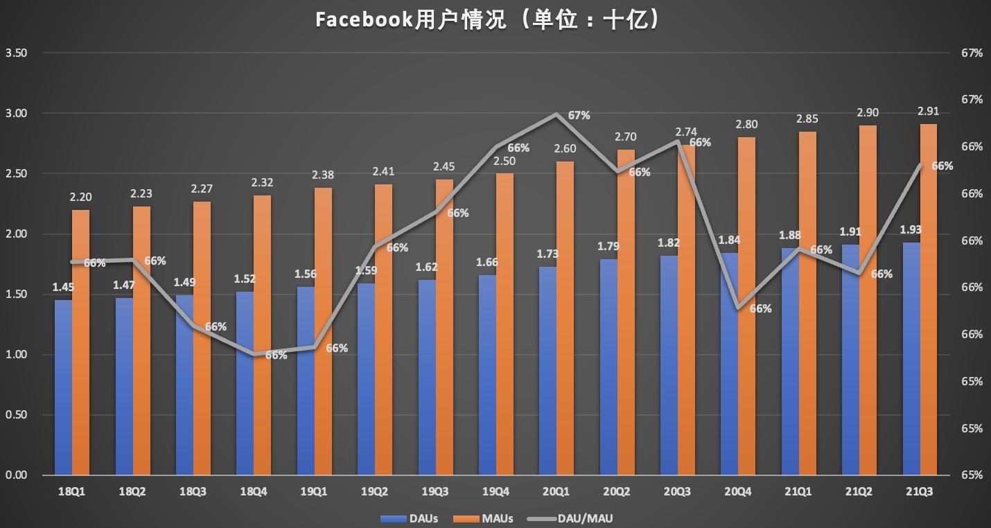 从 Facebook 本身 App 的用户黏性来看,如果用指标 DAU/MAU 这一指标来衡量,Facebook 单一平台的用户黏性持续维持在 66%。