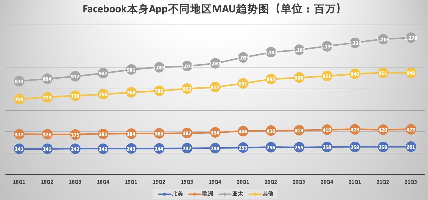 从 Facebook 单一平台月活用户增长情况来看,亚太地区是增长最快的地区。