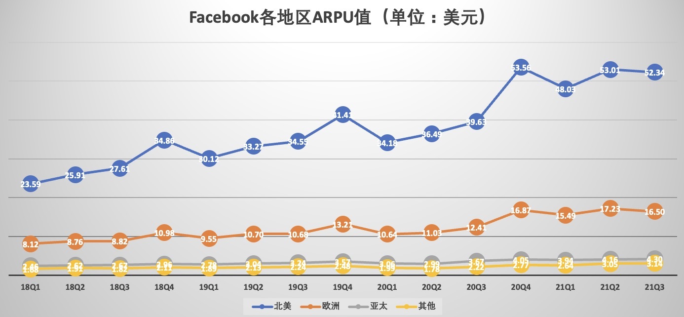 此外,ARPU 也是一项非常重要的衡量指标。从地区分布来看,北美地区作为 Facebook 收入最高的地区,北美地区用户变现能力也最强。不过需要注意的是,三季度,北美和欧洲地区的 ARPU 值较二季度均出现了不同程度下滑,相反亚太地区和其他地区,则呈现了不同的增长,释放了未来增长的潜能。